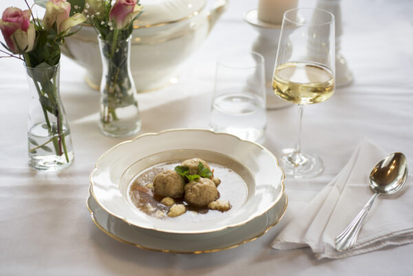 - Die Klöße werden traditionell in der Antonisuppe (Rinderkraftbrühe) serviert.