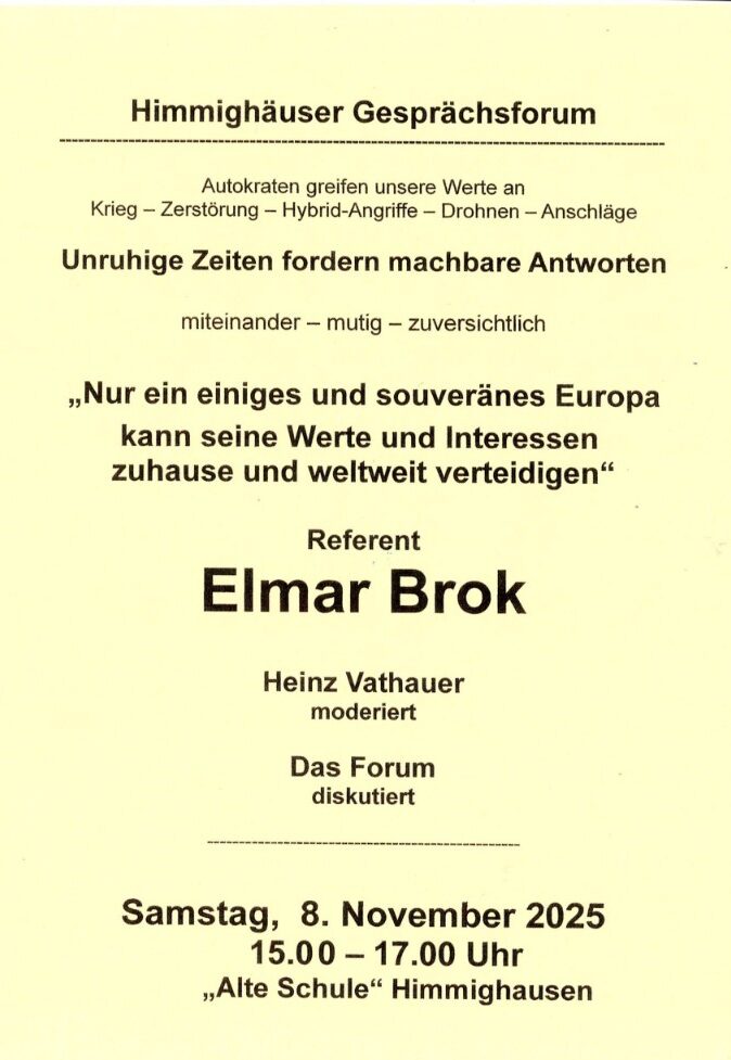 Mit einem Eingangsreferat von Elmar Brok, „Urgestein“ im langjährigen europäischen Engagement mit einem Schatz an Erfahrungen und mit Weitblick werden Fragen gestellt, Gegebenheiten analysiert und Antworten erarbeitet. Elmar Brok wird es auf den Punkt bringen: „Nur ein einiges und souveränes Europa kann seine Werte und Interessen zuhause und weltweit verteidigen. Wie stets wird es in dem offenen Forum genügend Zeit für lebendige Diskussionen geben, ganz nach dem Motto:,,miteinander, mutig, offen, zuversichtlich“.